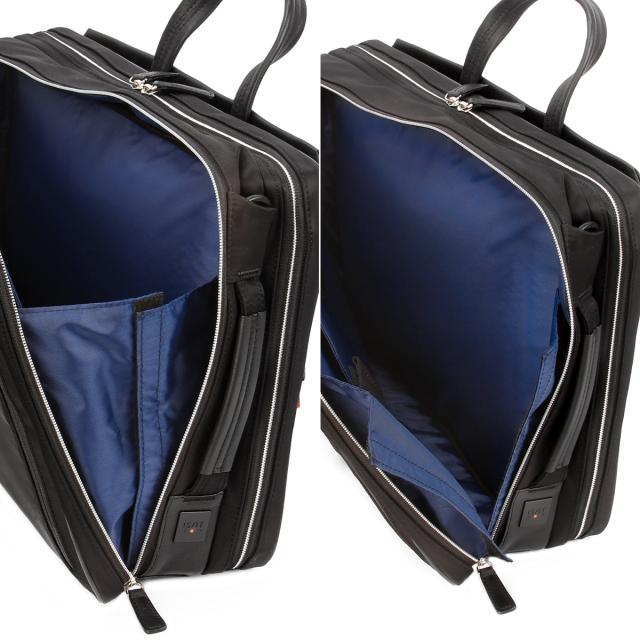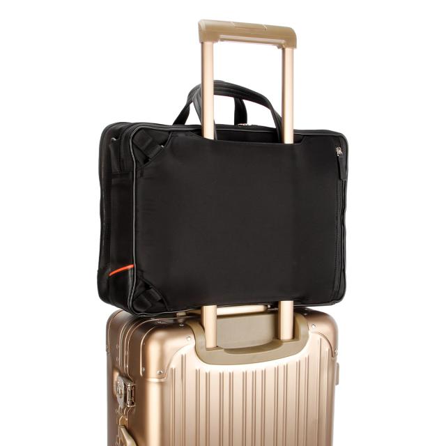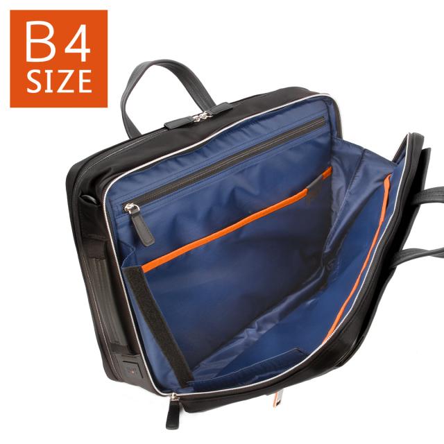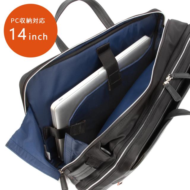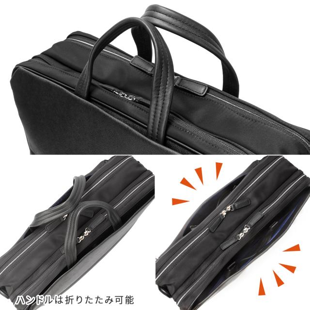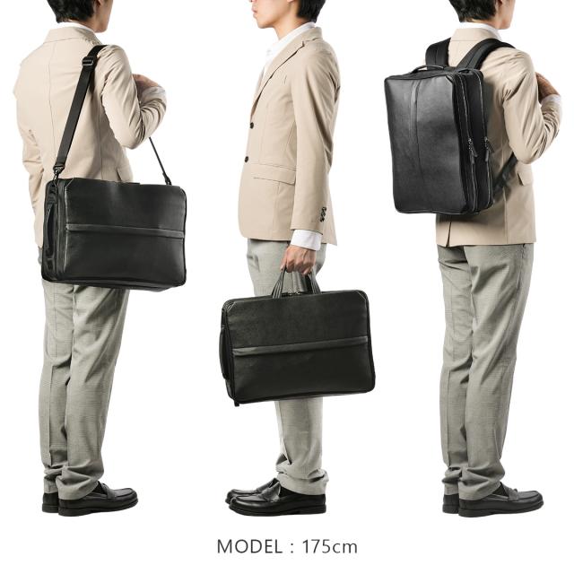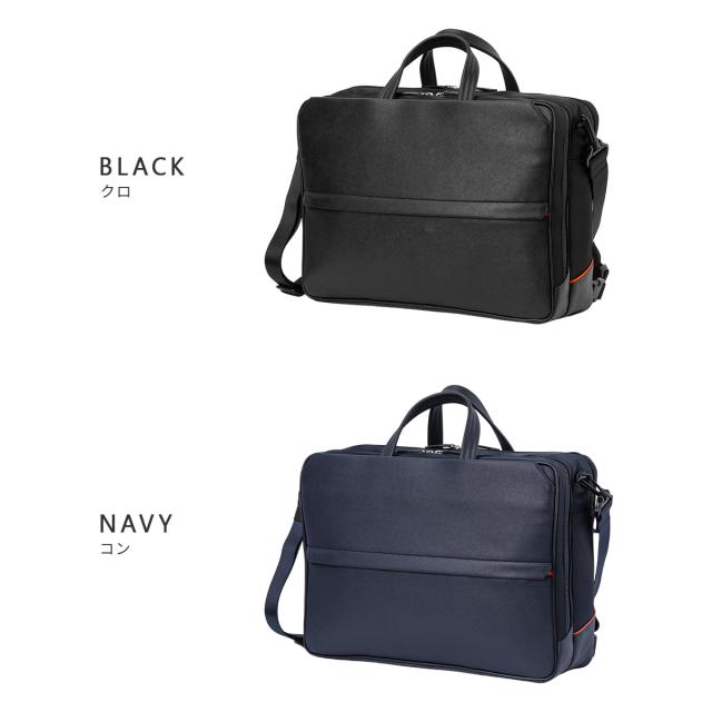 | 異素材コンビ 3WAYビジネスバッグ 前面にはサフィアーノ型合成皮革を、ハンドルには手に馴染む牛革を、そしてマチと背面にはナイロンを使用した異素材コンビでスッキリとしたデザインのB4サイズの3WAYビジネスバッグ。2層タイプで1泊2日の出張にも対応した大容量なビジネスバッグです。シーンに合わせて、リュックやショルダーとしてもお使いいただけます。 抜群の「収納機能」 豊富な収納ポケットで、ビジネスに必要なあらゆる荷物の持ち運びが可能です。B4ファイルがすっぽり収まるメインコンパートメントは前室と後室に分かれた2層タイプ。1泊2日の出張にも対応した大容量なビジネスバッグです。 前室にはファスナーポケットが1つ、大中小のポケットが1つずつ装備されています。ガジェット類など細かな荷物を整理して収納が可能です。後室には14インチPC収納対応ポケットがあり、出張先にもPCを持ち運ぶことができます。 また、ビジネスバッグの前面にはアオリポケットがあり、新聞やサッと取り出したい小物の収納に便利です。フロントのファスナーポケットは浅型に設計しており、さらに内側は見やすいオレンジ色のパイル生地を使用することで、スマートフォン等を入れても画面を傷つける心配がありません。 収納力だけじゃない機能 カバンの背側ファスナー内には、リュック紐が収納されています。バックルに装着してリュックスタイルとしても活躍します。マチ部分はマジックテープで開閉できるため、リュックとしてカバンを縦型に使うときもカバンの上部から荷物を出し入れすることができます。 バックル部分は普段使いする際は見えないように収まります。また、手持ちハンドルも前後の収納スペースに完全に入れておくことができるため、リュックを背負っている時や、カバンを斜め掛けにする時にも邪魔になりません。 背側にはセットアップ機能付きなので出張にも便利です。 |