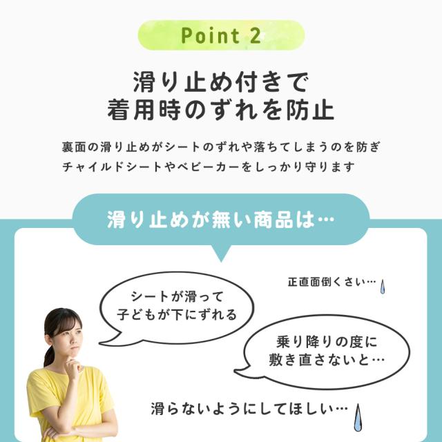 シートがずれたり落ちてしまうのを防ぎ、チャイルドシートやベビーカーをしっかり守ります。