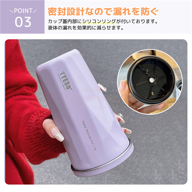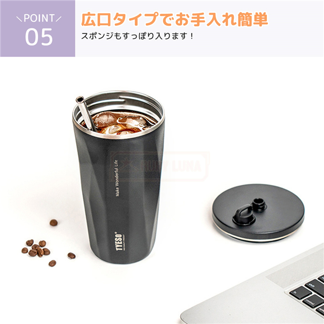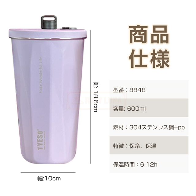 | 特徴 | ◆◆手のひらサイズ:女の子も片手で握られるサイズ、落としにくい。 ◆溢れにくいデザイン:カップカバーが付いており、液体が溢れにくい。 ◆ワイドサイズ設計:ワイドサイズ設計で、氷を入れることが便利です。 ◆様々な飲み物に適用:寒いものも、熱いものも入れられる。 ◆真空断熱層:熱量が伝わりにくく、保冷保温効力が長持ち。 ◆使用シーン:蓋の開閉がスムーズなので、お手入れも簡単!オフィス、自宅、学校、居酒屋などの所で手軽にコーヒーや紅茶などホットあるいはアイスの飲み物を楽しみましょう。 ◆注意:バッグなどに入れる際は、本体を縦置きにしてくださいませ。 |