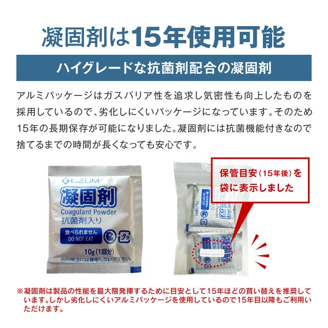 ※凝固剤は商品の性能を最大限発揮するために目安として15年ほどでの買い替えを推奨しています。しかし、劣化しにくいアルミパッケージを使用しているので、15年目以降もご利用いただけます。