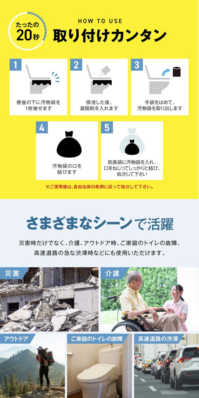 これ1つあればトイレ問題を解決できるセット品になっています。 セット内容:簡易トイレ×1、凝固剤×20、防臭袋×20、汚物袋×20、手袋×20、ティッシュ×2、