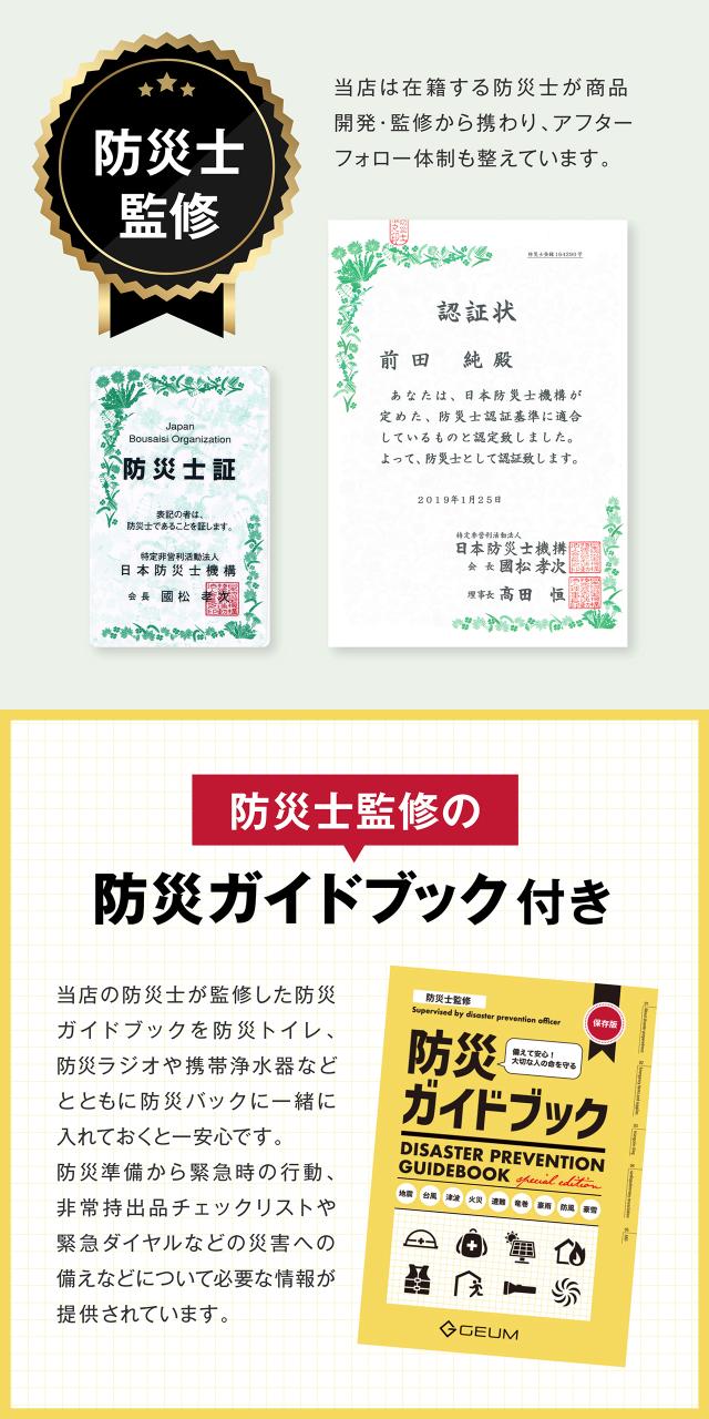 当店の防災士が監修した防災ガイドブックを防災トイレ、防災ラジオや携帯浄水器などとともに防災バックに一緒に入れておくと一安心です。防災準備から緊急時の行動、非常持出品チェックリストや緊急ダイヤルなどの災害への備えなどについて必要な情報が提供されています。