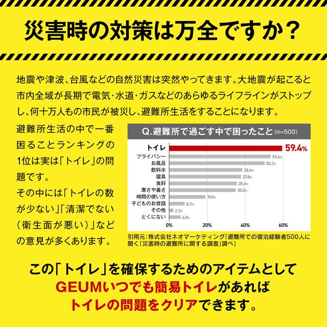 この「トイレ」を確保するためのアイテムとしてGEUMいつでも簡易トイレがあればトイレ問題をクリアできます。