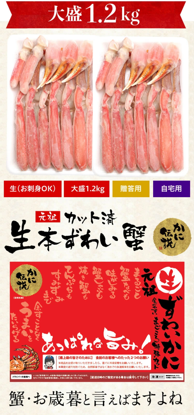 かに カニ 蟹 1.2kg|年末配送OK★8,888円送料無料 お刺身 蟹鍋 焼き蟹 かに カニ 蟹 カット済み 生本ずわい蟹1.2kg(600g×2個) のしOK ズワイガニ 鍋 カニ鍋 ポーション のし可 ギフト お歳暮 送料無料 trend_kaisen