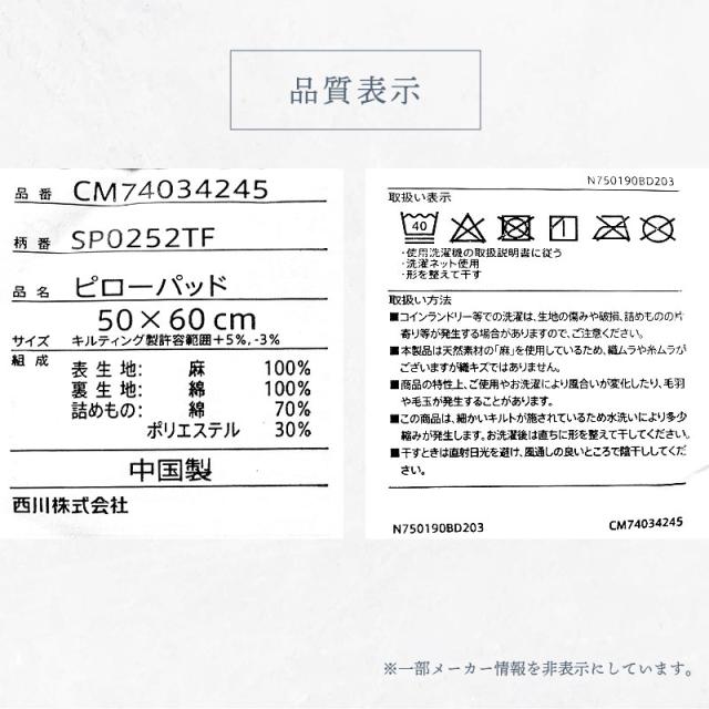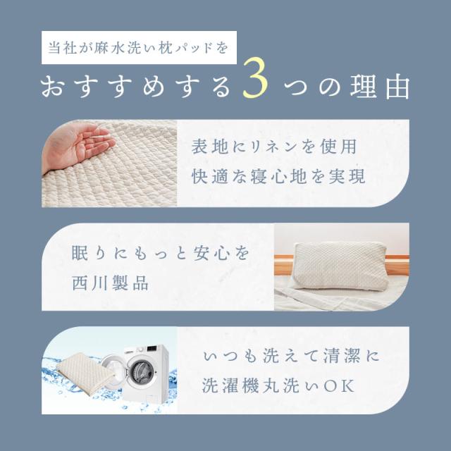 西川 枕パッド 43×63 実寸 50×60 水洗いキルト 表 麻100% リネン 通年 オールシーズン 洗える 洗濯機 涼感 枕カバー ピローパッド2025y5