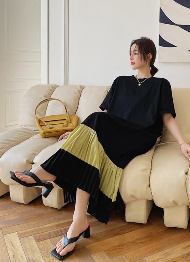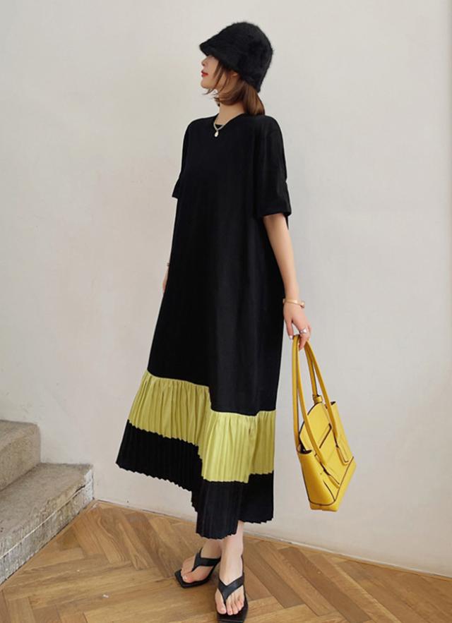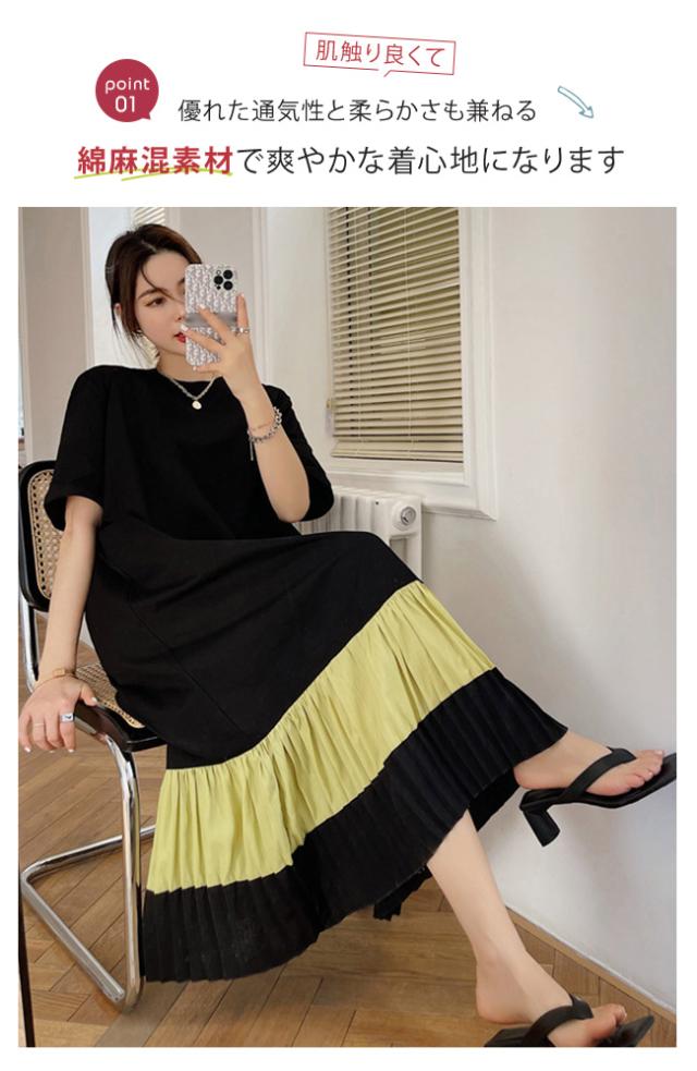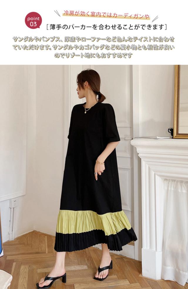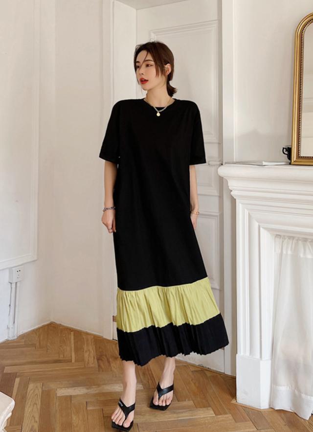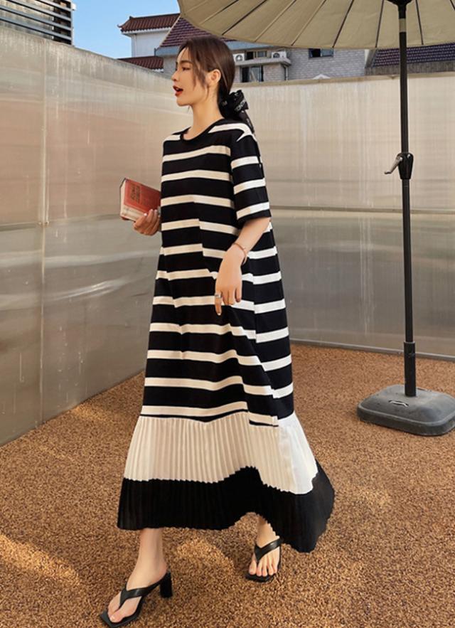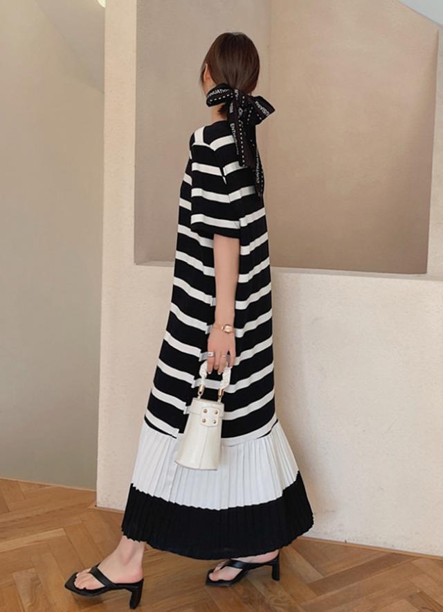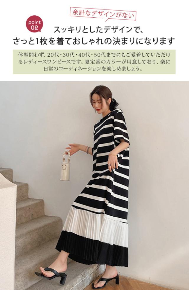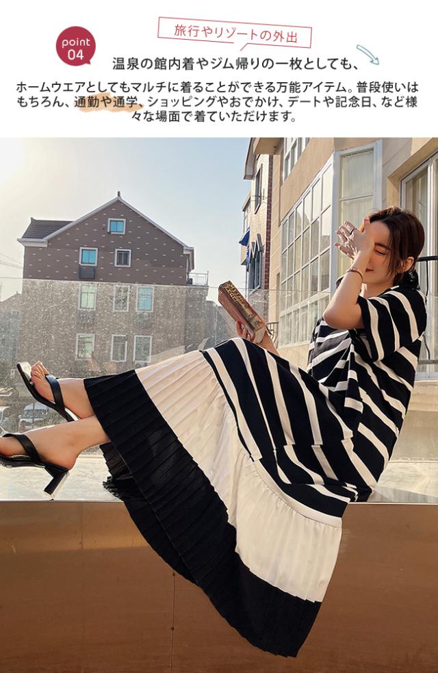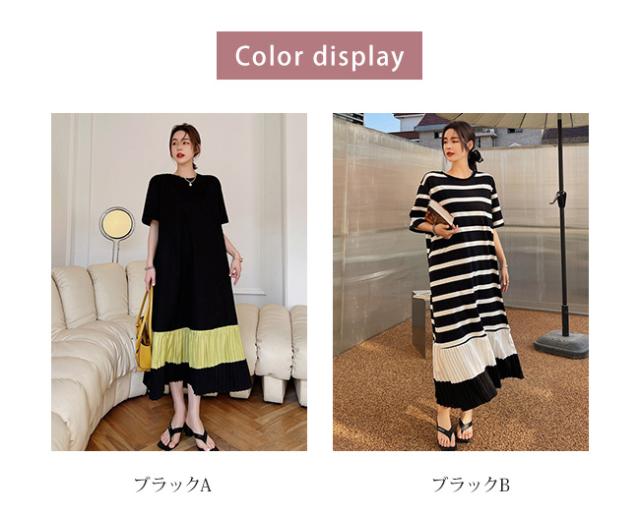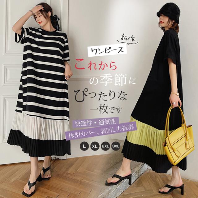 半袖 ワンピース レディース ロングワンピース Tシャツワンピース 裾プリーツ マキシ丈 ロングワンピース 重ね着風 ボーダー 切替え 通勤 ゆったり