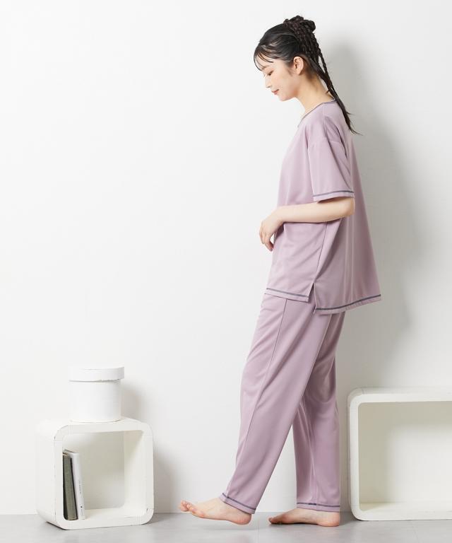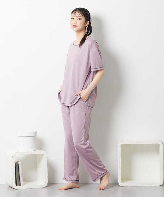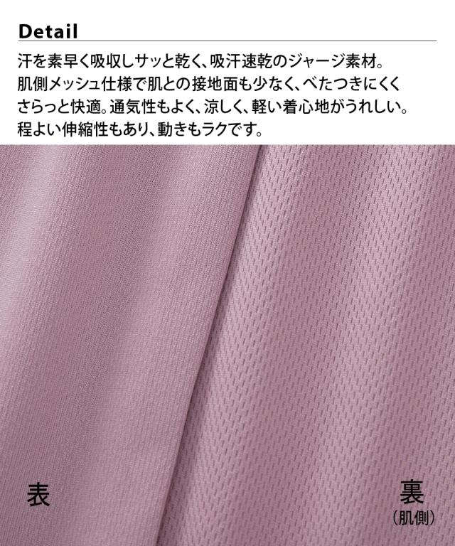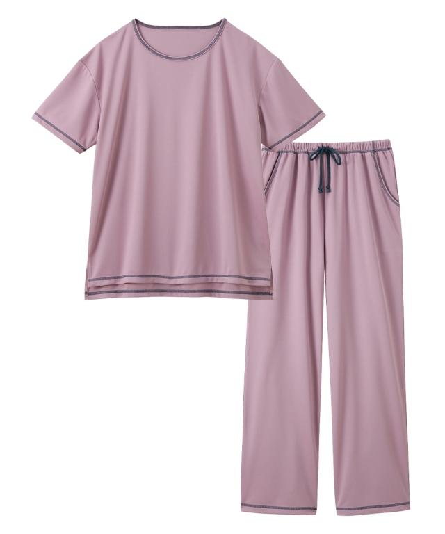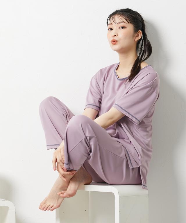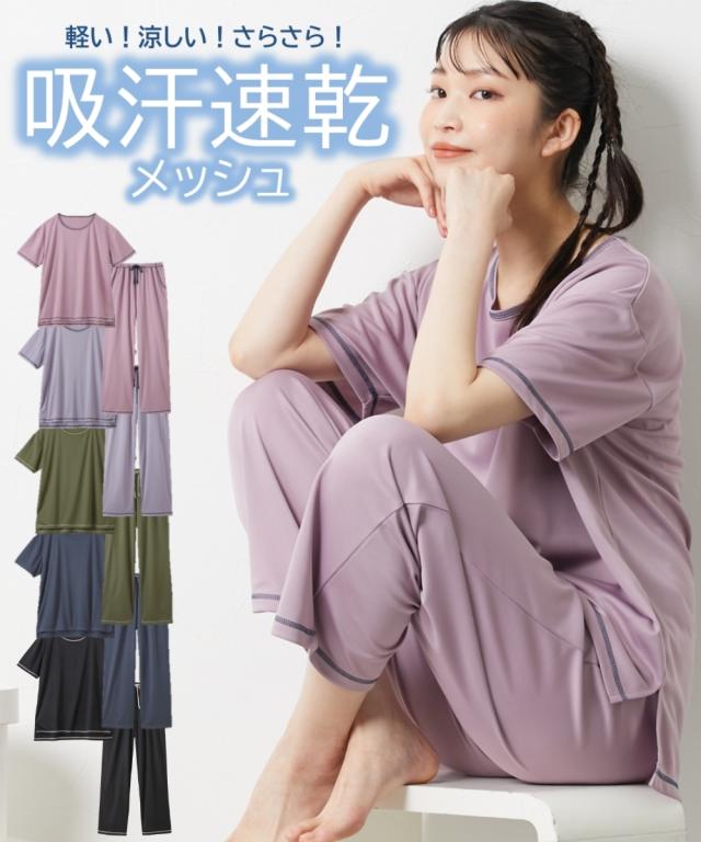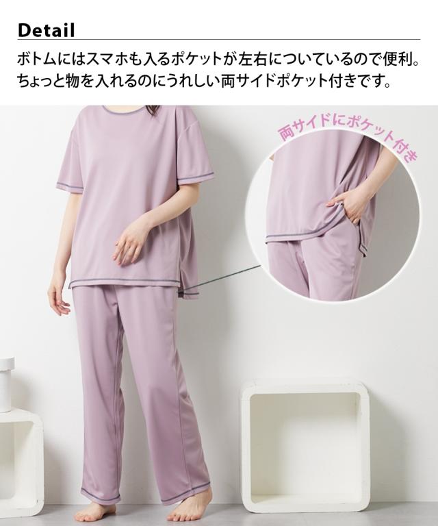 吸汗速乾ジャージシリーズ 動きやすく、ベタつきにくい吸汗速乾のジャージ素材のルームウェア。 ウエスト紐やポケットはなにかと便利。 家事やおうちでのストレッチやヨガ、テレワークや急な来客・・・自宅でのさまざまな場面で活躍します。 半袖のトップスとロング丈のボトムのセット。 配色ステッチのアクセントがポイントです。 こんな時におすすめです・おうちでのリラックスタイムに。 ・就寝時のパジャマとして。 ・家事するときに。 ・ストレッチやちょっと運動するとき。 ・ごみ捨てや来客などのちょっとそこまで、のときに。 ・テレワーク、ホームワークのときに。 【おすすめポイント】 ■さらっと快適、吸汗速乾素材 ムレにくく、さらりとした吸汗速乾素材を使用。 汗をかいてもすぐ乾くのでべたつきにくく快適。 洗濯後もすぐ乾くのがうれしい ■肌触りさらさら。軽くて楽な着心地 肌側メッシュ素材なので肌との接地面も少なくさらさら。 通気性もよく、涼しく、軽い着心地がうれしい。 ほどよい伸縮性があり、動きもラクです。 ■半袖トップスとロングボトムのセット トップスは夏にうれしい半袖。 足の露出が苦手な方、エアコンでの冷えが気になる方にもおすすめ