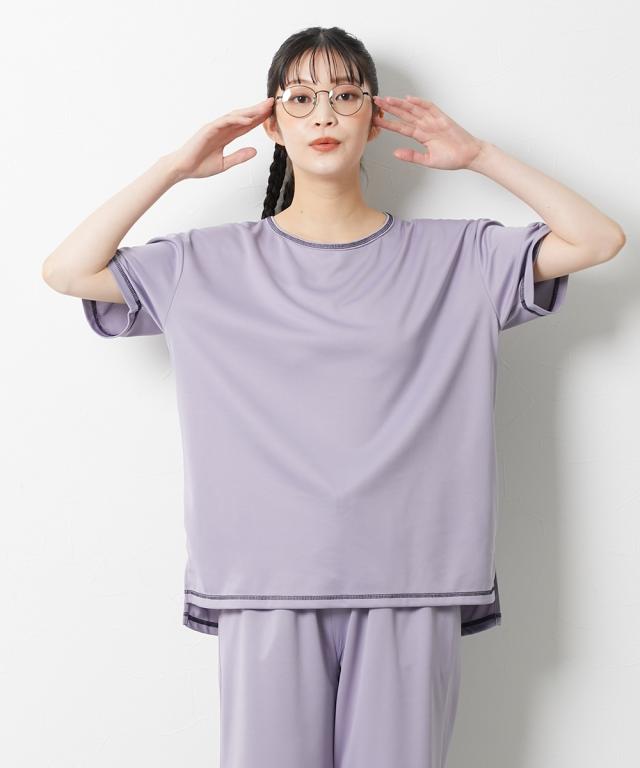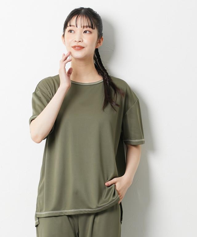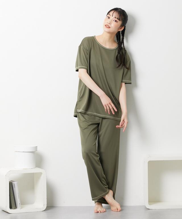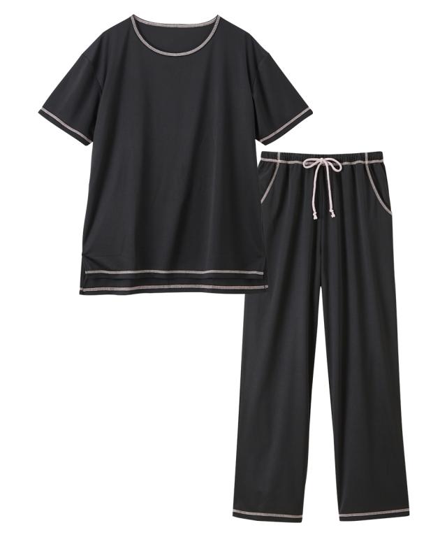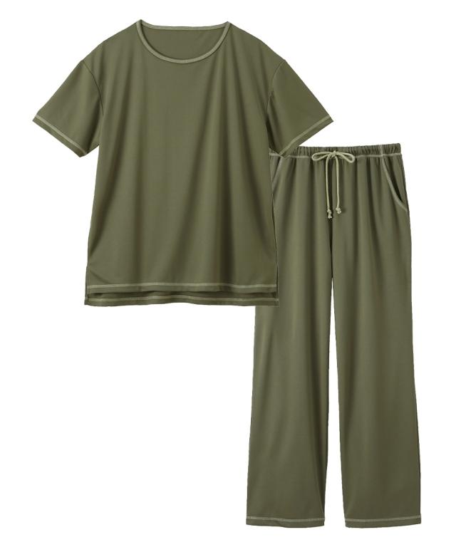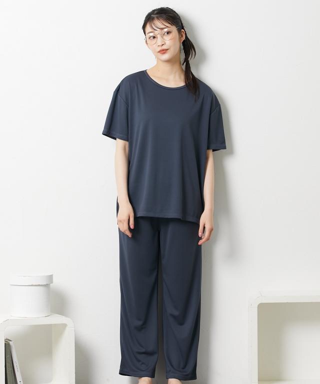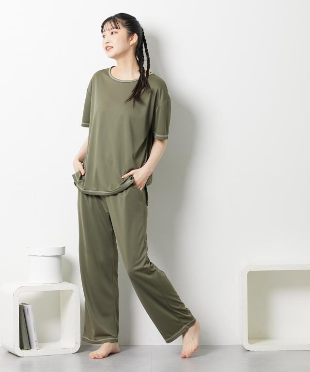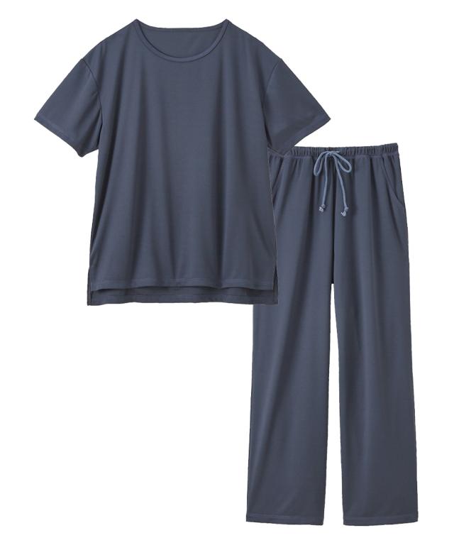 吸汗速乾ジャージシリーズ 動きやすく、ベタつきにくい吸汗速乾のジャージ素材のルームウェア。 ウエスト紐やポケットはなにかと便利。 家事やおうちでのストレッチやヨガ、テレワークや急な来客・・・自宅でのさまざまな場面で活躍します。 半袖のトップスとロング丈のボトムのセット。 配色ステッチのアクセントがポイントです。 こんな時におすすめです・おうちでのリラックスタイムに。 ・就寝時のパジャマとして。 ・家事するときに。 ・ストレッチやちょっと運動するとき。 ・ごみ捨てや来客などのちょっとそこまで、のときに。 ・テレワーク、ホームワークのときに。 【おすすめポイント】 ■さらっと快適、吸汗速乾素材 ムレにくく、さらりとした吸汗速乾素材を使用。 汗をかいてもすぐ乾くのでべたつきにくく快適。 洗濯後もすぐ乾くのがうれしい ■肌触りさらさら。軽くて楽な着心地 肌側メッシュ素材なので肌との接地面も少なくさらさら。 通気性もよく、涼しく、軽い着心地がうれしい。 ほどよい伸縮性があり、動きもラクです。 ■半袖トップスとロングボトムのセット トップスは夏にうれしい半袖。 足の露出が苦手な方、エアコンでの冷えが気になる方にもおすすめ