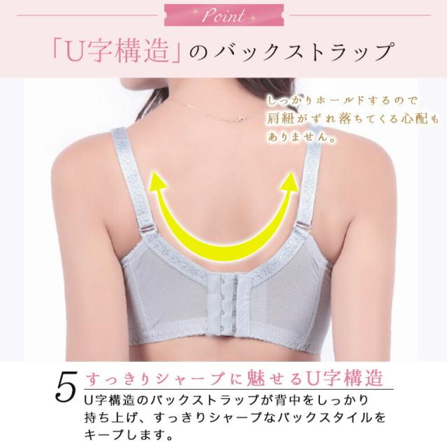 U字型のバックストラップが背中のぜい肉をキャッチし綺麗な後ろ姿、バストトップを高く上げることで綺麗な谷間、美胸に。