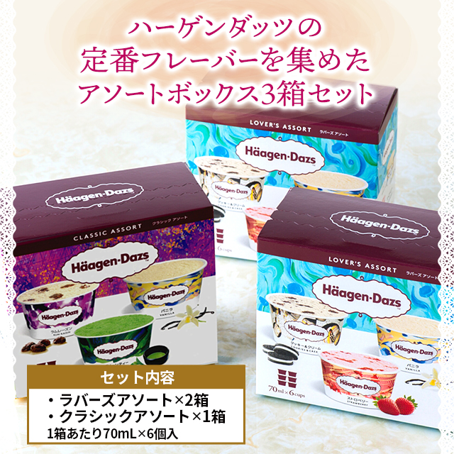 商品名 ハーゲンダッツ アソートボックスセット 3箱 HD71A 容量 アソートボックス 各70mL×6個入/3箱(ラバーズアソート×2箱・クラシックアソート1箱) 原材料名 《ラバーズアソート》