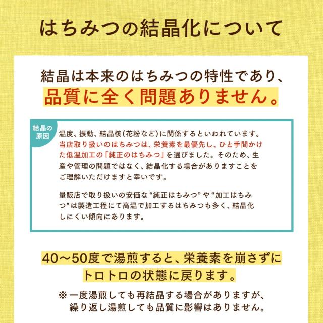 | 注意事項 | 一歳未満の乳児には与えないでください。(妊娠中・授乳中の方は、問題ありません。) 天然のハチミツですので採蜜時期や気象条件、地域などによって、蜂蜜の味や色が異なる場合がございます。 無添加・着色をしていない証明です。天然ならではの自然の変化をお楽しみ頂ければと思います。 |