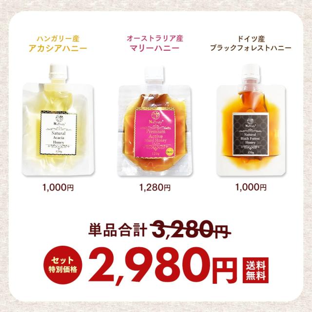 | 原産国 | ナチュラルアカシアハニー:ハンガリー マリーハニーTA35+:オーストラリア ブラックフォレストハニー:ドイツ |