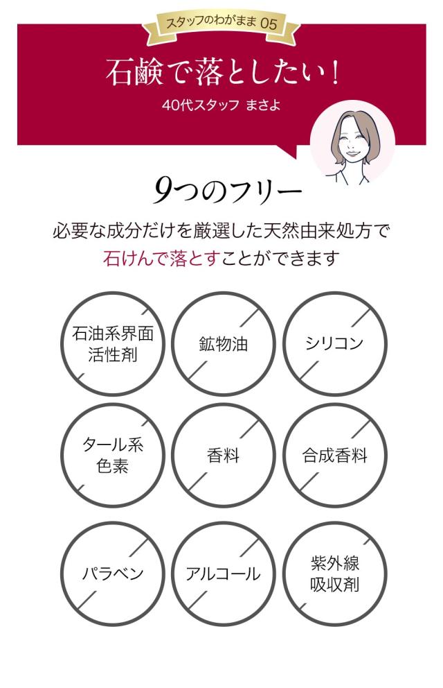 マイカ、トリ(カプリル酸/カプリン酸)グリセリル、ヘキサ(ヒドロキシステアリン酸/ステアリン酸/ロジン酸)ジペンタエリスリチル、セスキイソステアリン酸ソルビタン、ヒアルロン酸Na、ホホバ種子油、セラミドNG、セラミドAP、セラミドAG、セラミドNP、セラミドEOP、水添レシチン、フィトステロールズ、トコフェロール(+/-)合成フルオロフロゴパイト 、シリカ、カオリン、酸化チタン 、水酸化Al 、酸化スズ 、酸化鉄、カルミン、グンジョウ