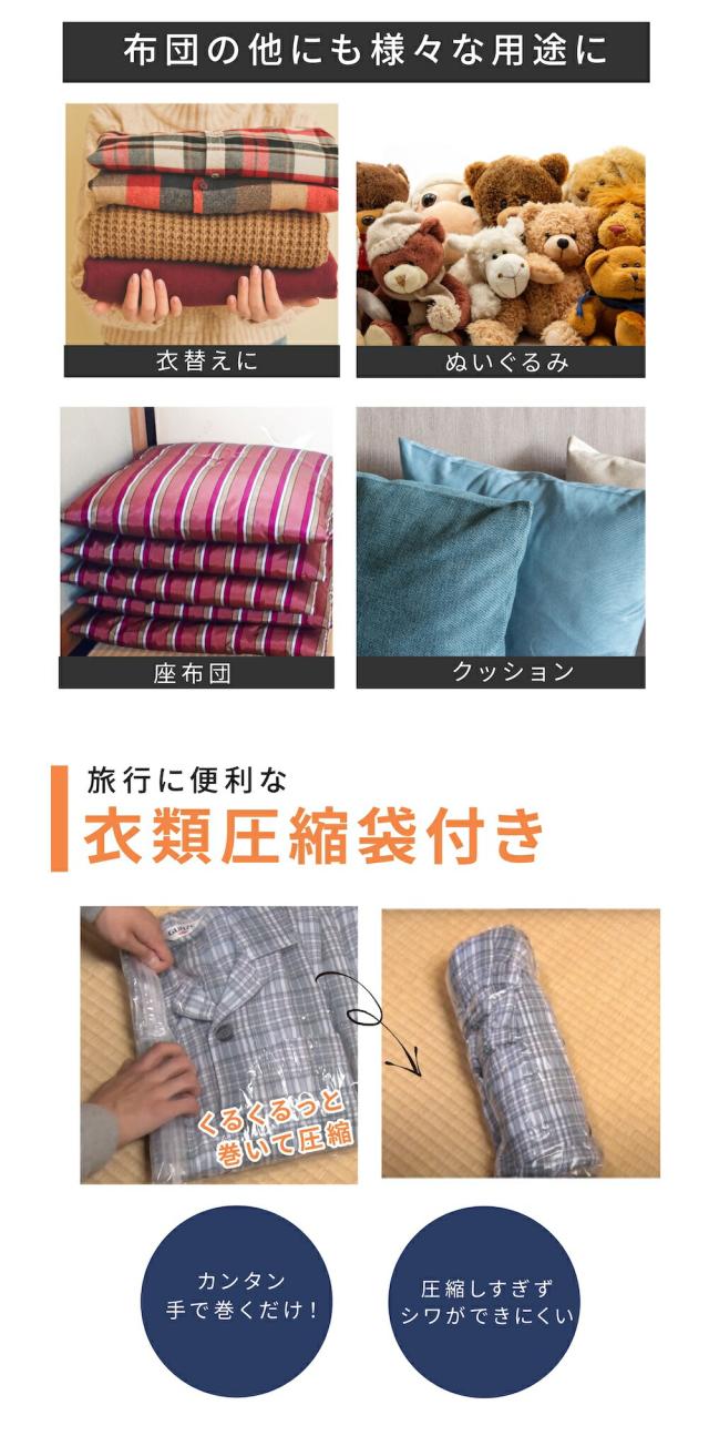 ・竹炭シート布団用には消臭・カビ・ダニを抑制する竹炭シート付きで旅行に便利な衣類圧縮袋付き。 くるくるっと巻いて圧縮できます。