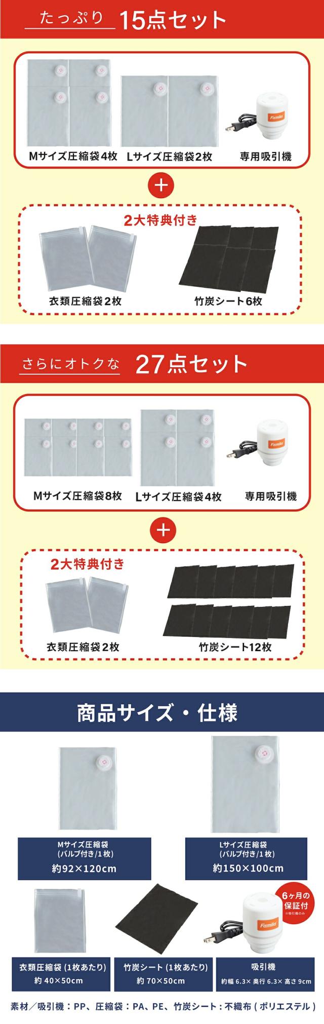 | セット内容 | 27点セット:吸引機×1、Mサイズ圧縮袋×8枚、Lサイズ圧縮袋×4枚、衣類圧縮袋2枚、竹炭シート×12枚 |