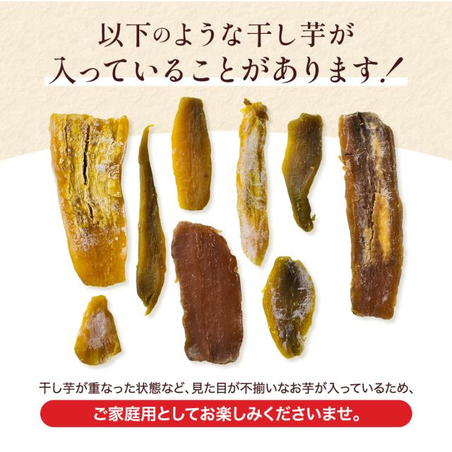 【品質特性】この商品はさつまいもを蒸かして、干しただけの加工品ですので原料の成分や気温、加工時期により硬さ・糖度(甘味)・色の違いが生じます。また天日干し特有の匂いが発生する場合がございます。表面に繊維や黒ずみ、芋の皮由来による黒い斑点が見られることがありますが品質に問題ありません。