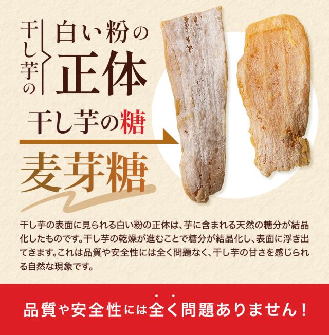 表面に発生する白い粉は、麦芽糖が結晶化した物ですので安心してお召し上がりできます。こちらの商品は選別の際にはじかれた規格外品の干し芋の詰合せとなります。その為小さい切れ端の干し芋や、糖化が進み見た目が黒っぽくなった干し芋や、見た目が所々白くなっている干し芋等を無選別にパックされている事をご理解下さい。