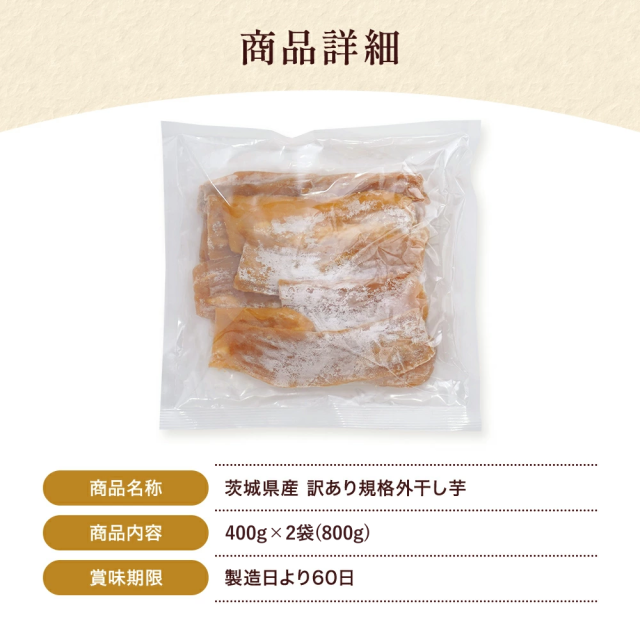 そんなお買い得な規格外品の干し芋を400g×2袋(800g)の大容量でご用意。ご自宅用に大変お勧めとなっております。