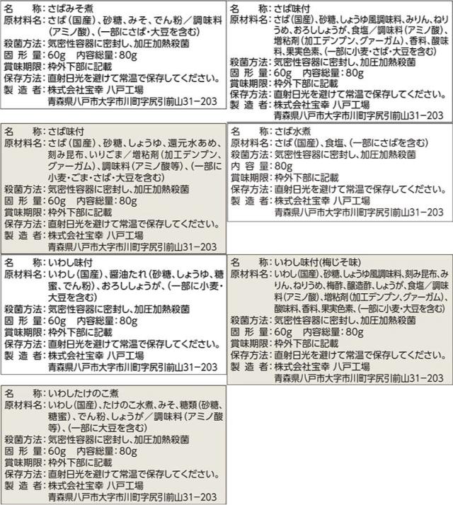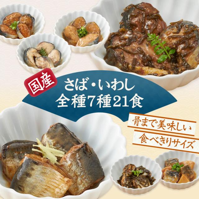 | 内容量 | ■ お惣菜にもう一品 さば味噌煮 80g さば梅じそ風味 80g さばごま昆布 80g さば水煮 80g いわし味付 80g いわし梅じそ昆布 80g いわし味噌煮たけのこ入り 80g 7種 各3食 合計21食 |