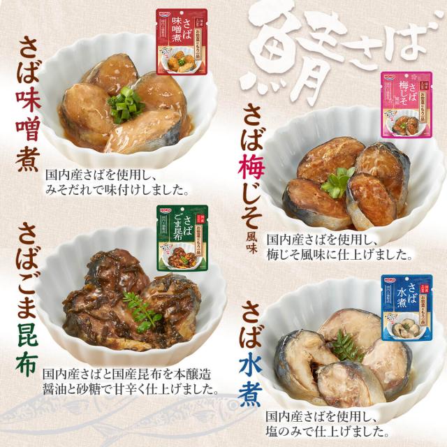 国産 サバ イワシ を 味噌 しょうゆ 梅じそ の様々な味付で 骨まで美味しく食べられるよう 調理 した 和風 魚惣菜 。