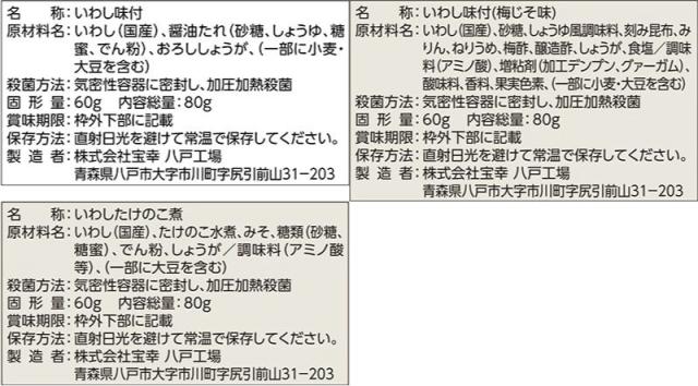 | 内容量 | ■ お惣菜にもう一品 いわし味付 80g いわし梅じそ昆布 80g いわし味噌煮たけのこ入り 80g 3種 各6食 合計18食 |