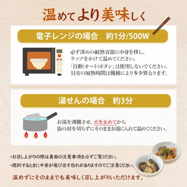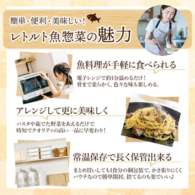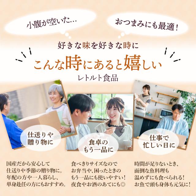 イワシ缶 のように 常温 で 保存 でき、 食べきりサイズ で レンジ 湯煎 で 温めるだけ そのまま 常温 でも 美味しい から 忙しい時の 一品 や お弁当 の おかず にも おすすめ です。