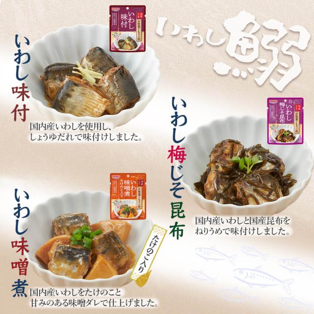 国産 イワシ を 味噌 しょうゆ 梅じそ の様々な味付で 骨まで美味しく食べられるよう 調理 した 和風 魚惣菜 。