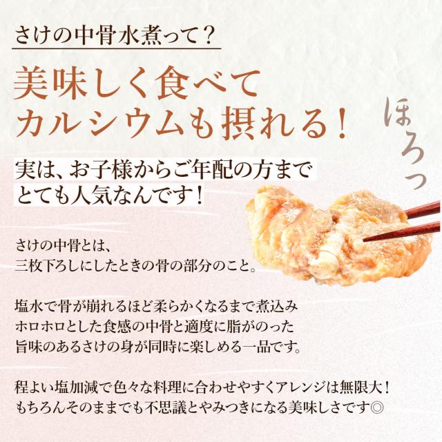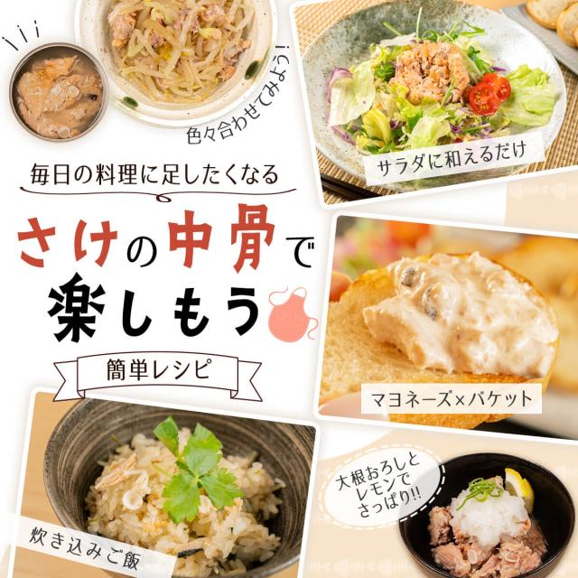 | 内容量 | ■さけ中骨水煮・銀鮭中骨水煮ミックス24缶セット さけ中骨水煮 150g 12缶 銀鮭中骨水煮 150g 12缶 ■さけ中骨水煮 150g 24缶セット ■銀鮭中骨水煮 150g 24缶セット 3種類のセットからお選びいただけます。 |