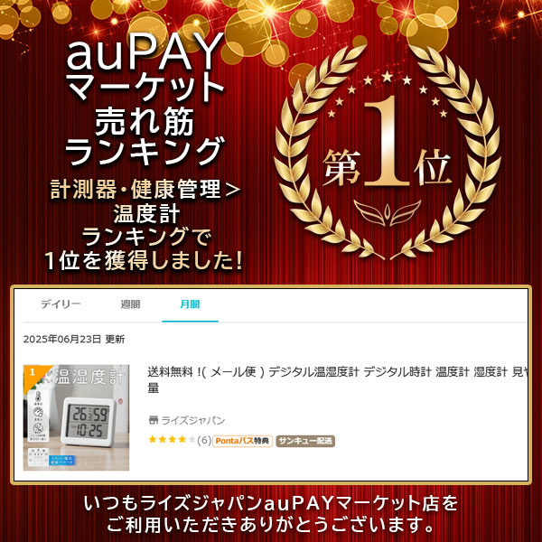- 母が湿度計が欲しいと探していたので見やすいしコンパクトで場所もとらなくていいかなぁと思い送りました。到着も早くとても喜んでいました。