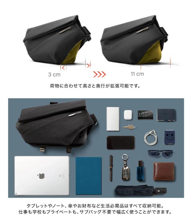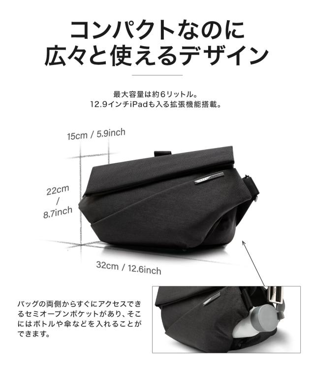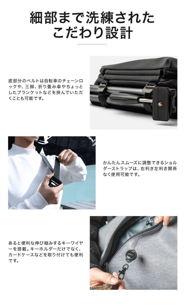 ウォーキング、ランニング、サイクリングなどシーンに合わせて瞬時に長さを調節。 さらに左右どちらの肩にかけても違和感のない設計になっています。 長さ調節と荷物をかける肩の入れ替えで、肩への普段を最大限抑えます。