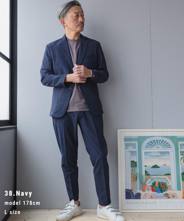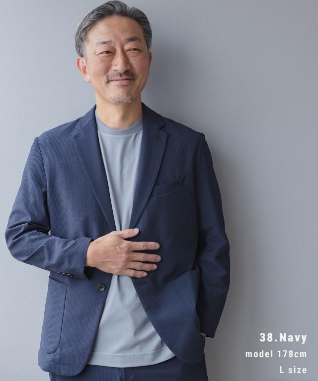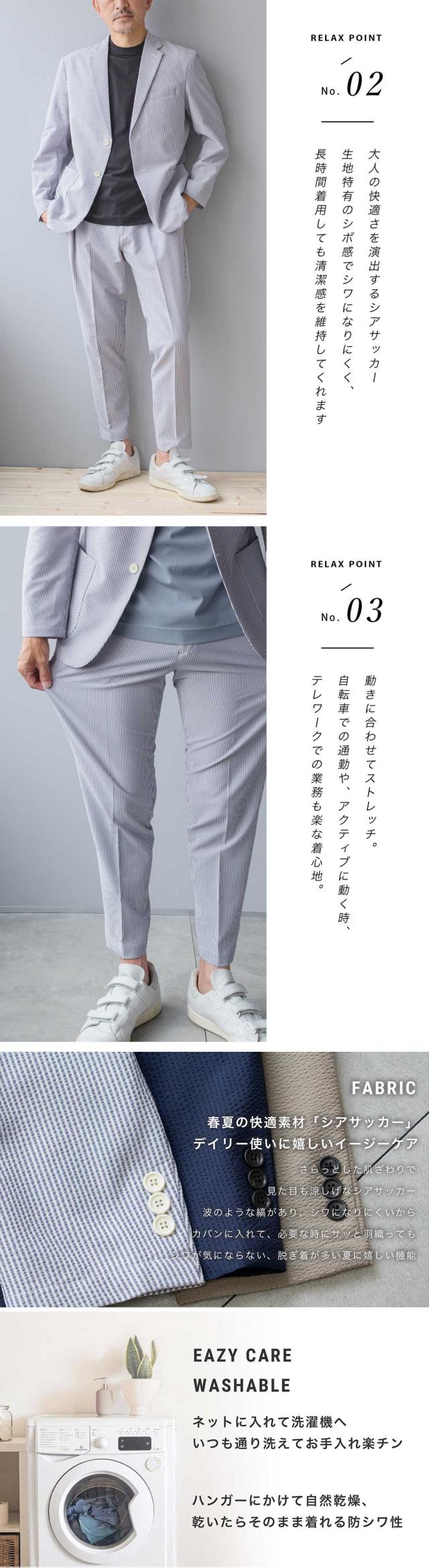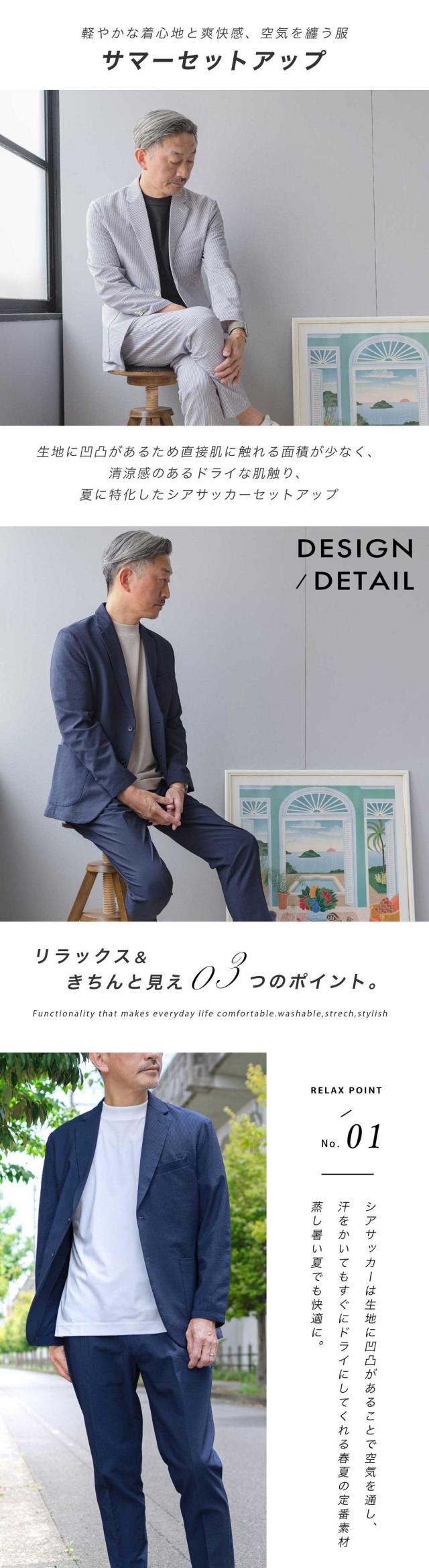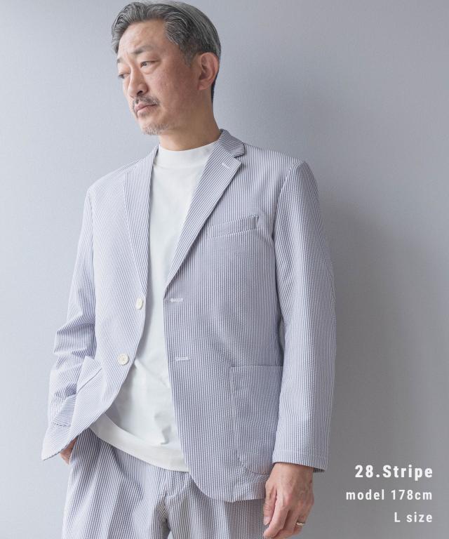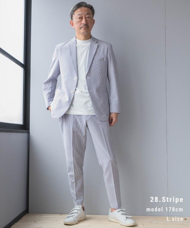 軽やかな着心地と爽快感、空気を纏う服「 シアサッカー サマー セットアップ 」大人の特徴的なシボ感が大人の快適さを演出してくれる春夏に洗えて、シワになりにくい カジュアルスーツ