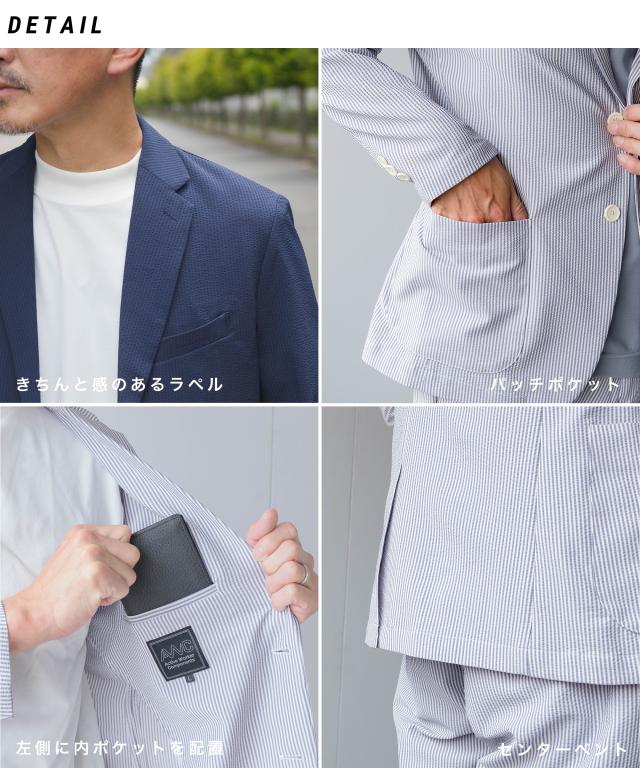 セットアップ メンズ スーツ 夏 ストレッチ ブランド AWC 夏用 シアサッカー 伸びる 春夏 カジュアルスーツ テーラード 上下セット 涼しい 洗える ウォッシャブル ウエストゴム オフィスカジュアル クールビズ 20代 30代 40代 50代 ブルー ストライプ ネイビー 紺
