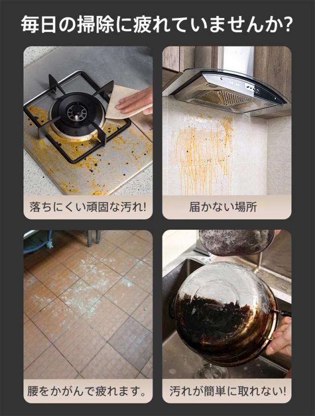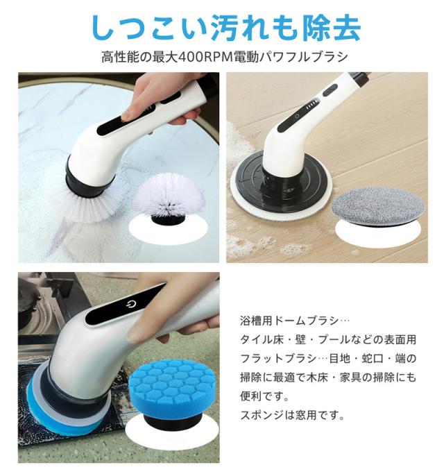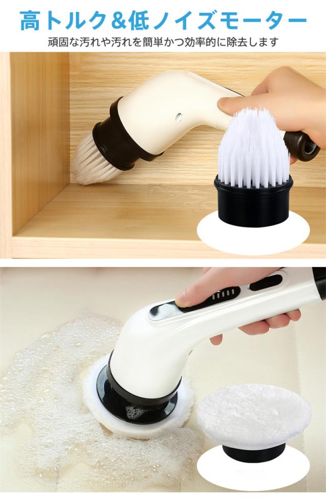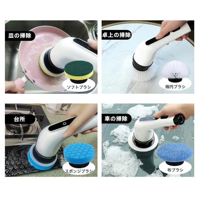 異なるアタッチメントが6個付属され、様々の掃除場面に対応でき、お風呂の掃除、窓ガラスの磨き、台所の油汚れ取り、更に車磨きまで対応できます。