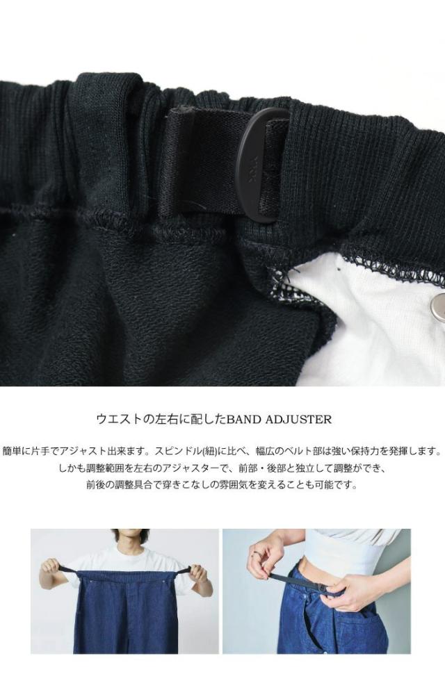 サイズが一つしかないのでサイズ選びが不要となっており、サイズレンジはXSからXXLまでカバーします。これ1本でワンマイルウエアとして、家族でも、体格の異なる友達ともシェアが可能です。その秘密はウエストの左右に配したBAND ADJUSTERにあります。簡単に片手でアジャストできます。スピンドル(紐)に比べ、幅広のベルト部は強い保持力を発揮します。