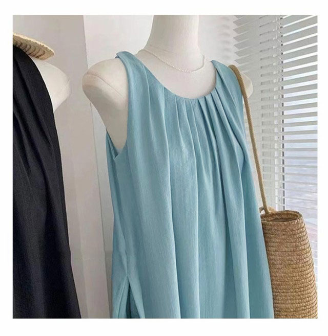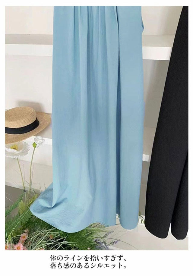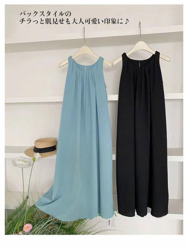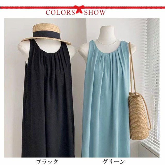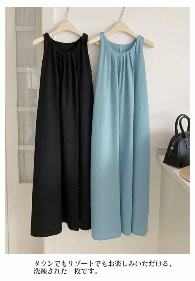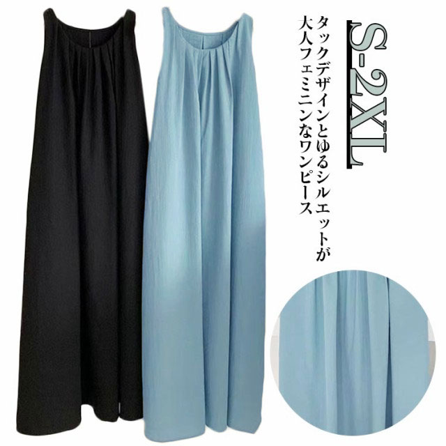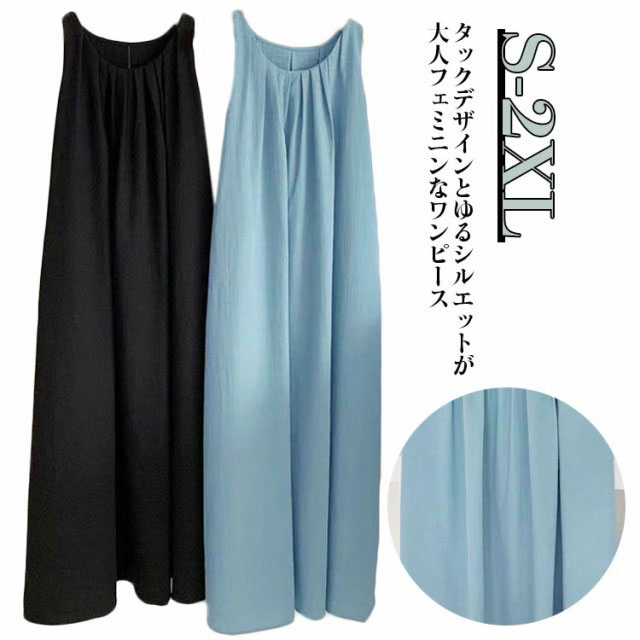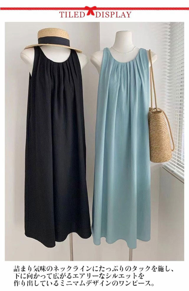 ワンピース ノースリーブ ギャザー ポケットあり 袖なし タック入り ロング丈 体型カバー Aライン 着痩せ 大人可愛い リゾート きれいめ シンプル 無地