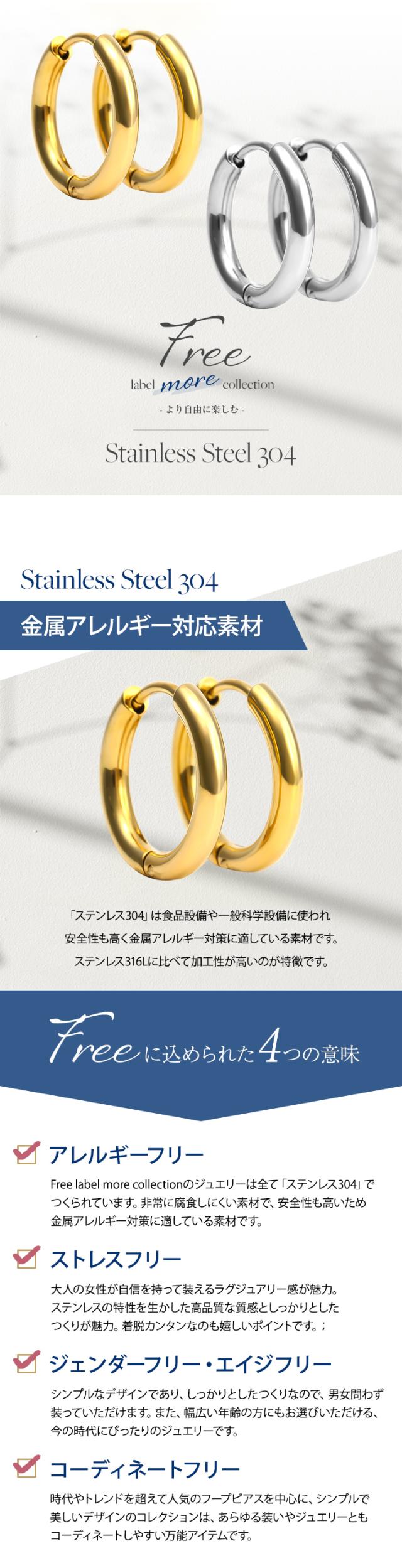 | 「 ステンレス304 」は、汗などに接触しても金属が溶け出しにくく、アレルギー反応を起こしにくい、「 金属アレルギー対応 」の肌に優しい素材です。ステンレスには必ず番号がありますので「 Stainless steel 304 」など、番号が明記されている商品のご購入をおすすめします。 ”錆びにくく変色も少ない”ため、汗をかいてもかぶれない、かゆくならないことが多く、スポーツや「 つけっぱなし 」にされたい方にも人気。さらにキャッチがなく、着脱も簡単で、女性だけでなく男性にもおすすめです。" ノンアレルギー "対応の「 アレルギーフリーピアス 」として、ジュエリースタジオ プラスターの【 フリーレーベルコレクション 】が好評を得ています。 ※アレルギー反応には個人差がございますので、全ての方に適合するものではありません。 |