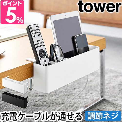 「tower テーブル横リモコンラック」は、テーブル横に収納スペースを作れるバスケット。卓上の細々とした小物をスッキリ整頓できます。調節ネジで取り付け簡単!机広々!座ったまま手が届くので片付けも使い勝手もラクラク!リビングダイニングや書斎のデスクにあるリモコンやメガネ、タブレット端末、ゲーム機、調味料ボトル、カトラリー、文房具などの収納に便利です。
