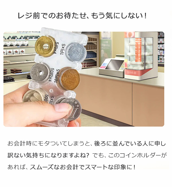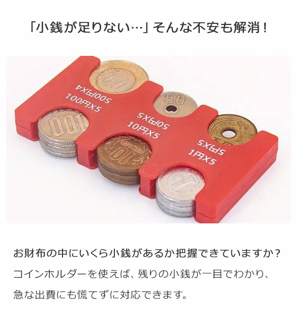 収納可能数:1円×5枚、5円×5枚、10円×5枚、50円×5枚、100円×5枚、500円×4枚