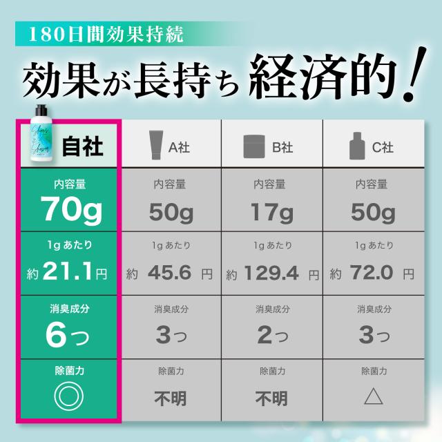 【経済的で長期的な効果】:1週間程度継続して使用することで、最大180日間消臭効果が続きます。70gの大容量でコストパフォーマンスに優れています。定期的な買い替えの手間を減らし、経済的負担も軽減します。