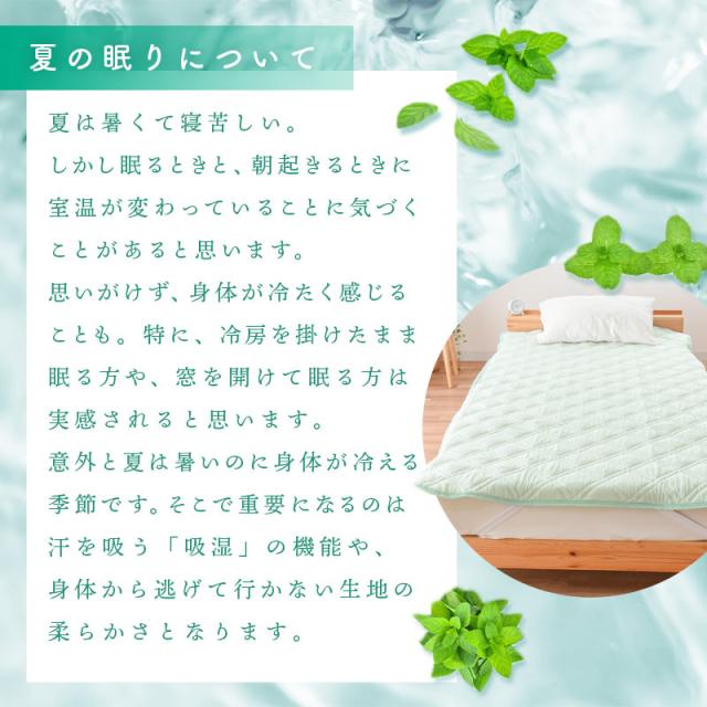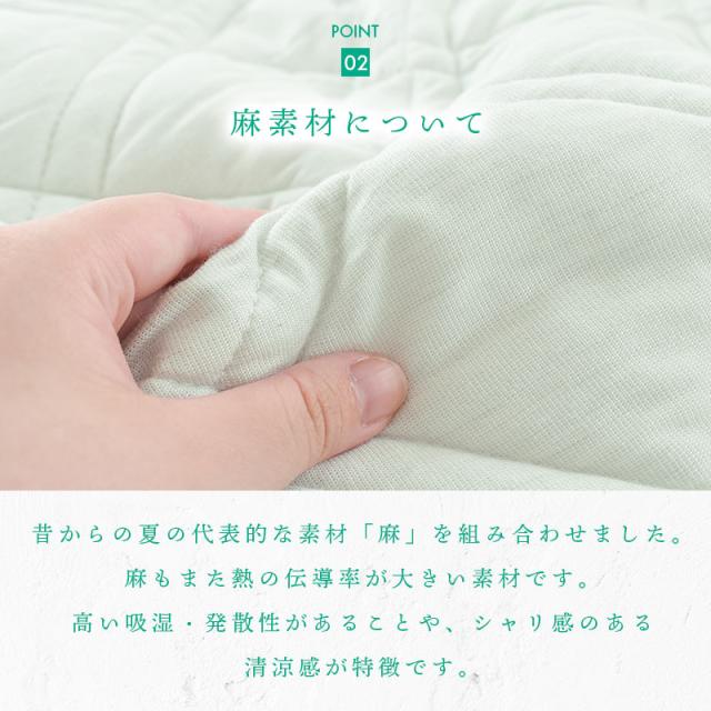 | ・麻素材について 昔からの夏の代表的な素材「麻」を組み合わせました。麻もまた熱の伝導率が大きい素材です。高い吸湿・発散性があることや、シャリ感のある清涼感が特徴です。 ・しなやかでやわらかく、シャリっとした生地感・西川株式会社×こだわり安眠館オリジナル商品 品質にこだわりたいという方も安心。当店と日本有数の寝具メーカー「西川」が共同開発したオリジナルの商品です。 ・洗濯機で丸洗いOK!じゃぶじゃぶ洗えていつも清潔直接お肌に触れるものだから「洗える」を条件に選びたい。洗濯機で丸洗いOKなので、汚れても気軽にご自宅でお洗濯できいつでも清潔にお使いいただけます。 | |