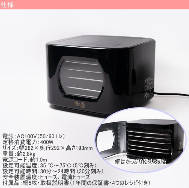さまざまな食材の乾燥品を短時間で手軽に作ることができるフードドライヤー。 魚やお肉はもちろん、果物を使ってのドライフルーツ作り、ヘルシーなペットのおやつなど自分だけのオリジナル干物を天候に影響されず好きな時に作ることができます。 大型ファンが背面にあることで、ヒーターの熱をムラなく循環させやすい構造。 付属の網はステンレス製で錆びにくいことから、塩分を使った魚等の干物づくりに適しています。 干すことで得られる凝縮されたうまみは乾燥の程度で調整でき、さらに味もお好みに調整できるので、魚や果物、肉、野菜など様々な食材でオリジナルレシピを作ることが可能。 自分好みのレシピを作るだけでなく、作る過程を楽しむという新しい楽しみ方を体験できます。 炊飯器レベルのコンパクトな大きさで邪魔にならず、また黒を基調とした高級感あふれるデザイン、シンプルでスタイリッシュな形状。 |