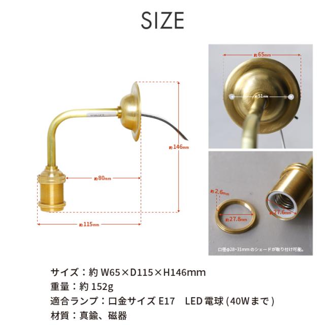 | 仕様 | 口金:E17 定格電圧:100V 対応電球:LED電球専用(40Wまで) 取り付け方法:壁付け ※壁付け専用照明器具です(埋め込み配線)。取付けは必ず電気工事店にご依頼ください。 ※照明器具にはスイッチは付いておりません。壁スイッチをご使用ください。 ※シェード・電球は付属しておりません。 ※口径28mm-31mmのシェードを挟み込み可能。 |