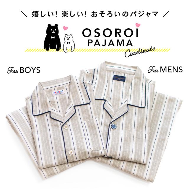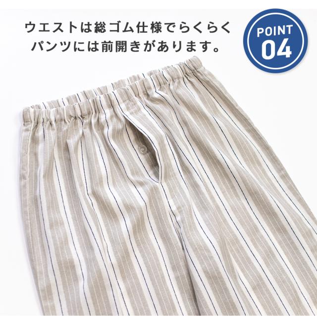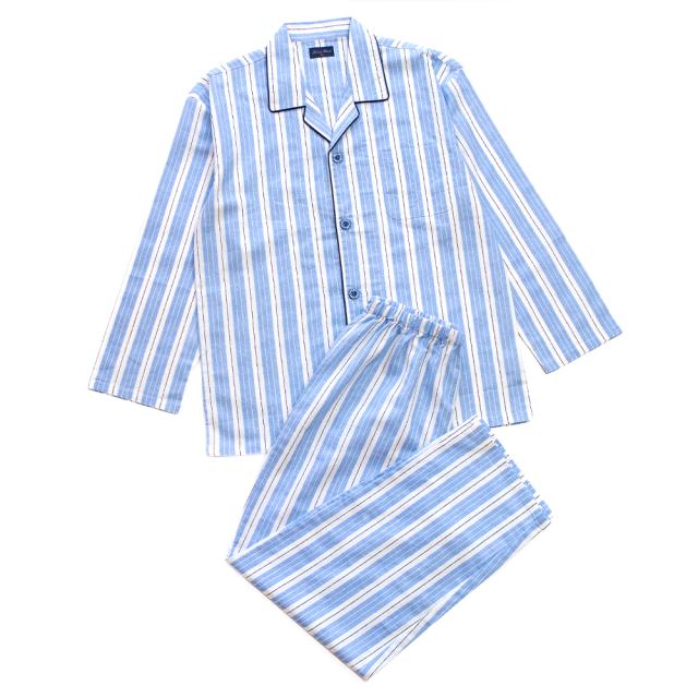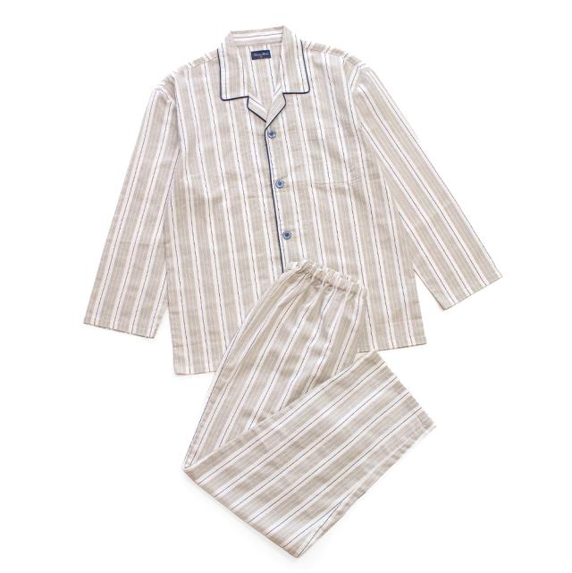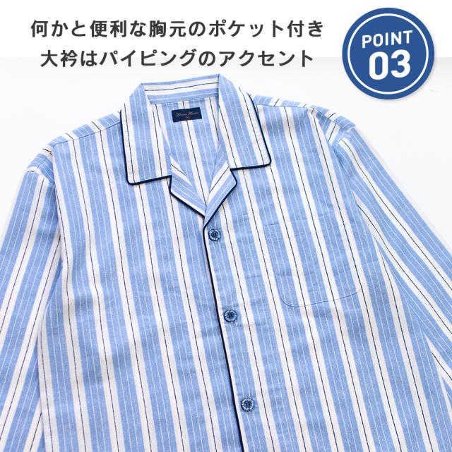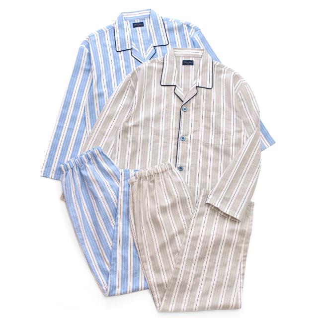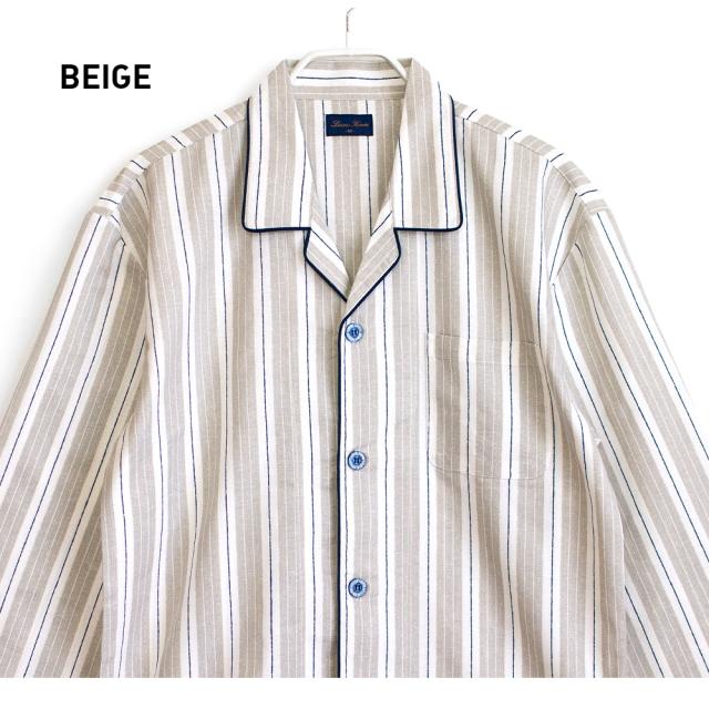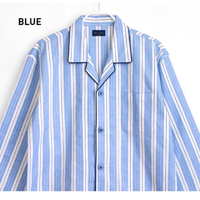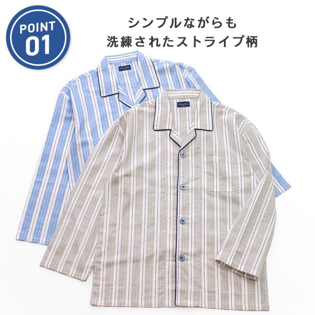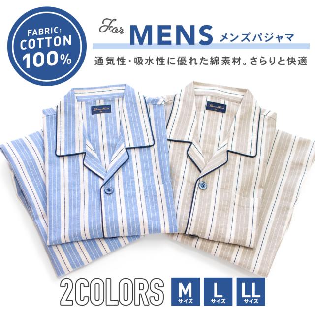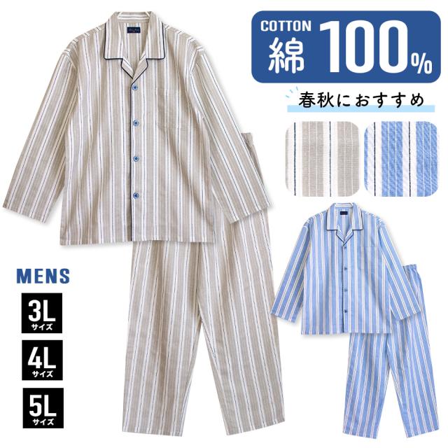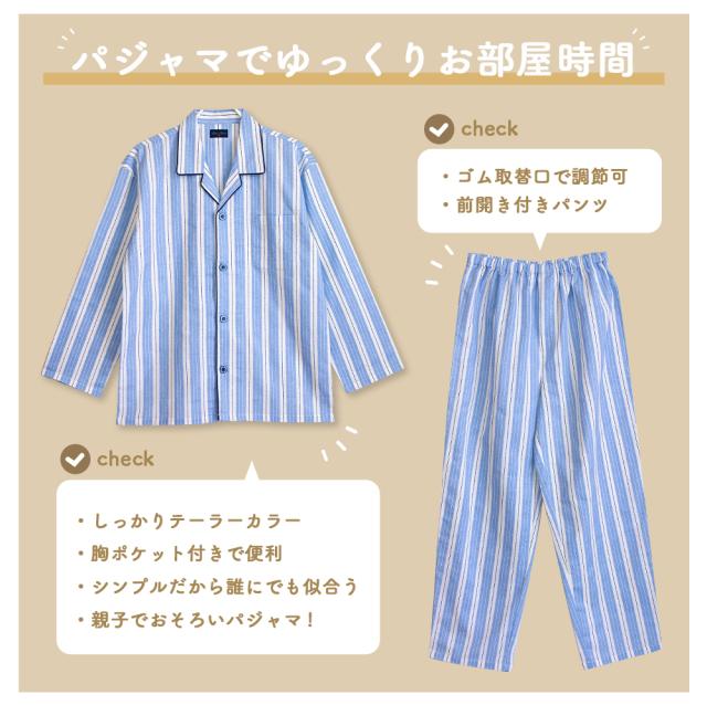 パジャマ メンズ 綿100% 長袖 春 秋 前開き ボタン ストライプ柄 ブルー ベージュ M L LL 親子 おそろい 50653