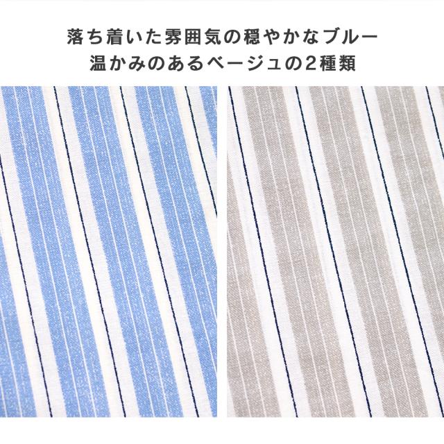 起毛のないサラッとした肌ざわりです。シンプルながらも洗練されたストライプ柄です。選べるカラーは落ち着いた雰囲気の穏やかなブルーと温かみのあるベージュの2種類です