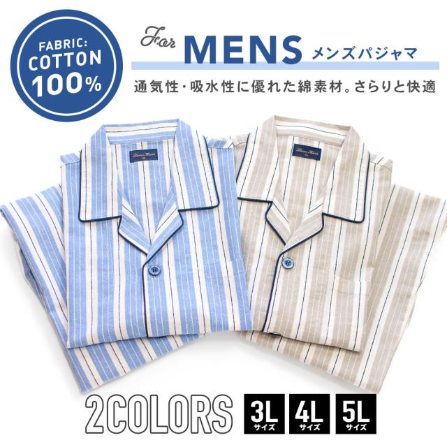 パジャマ メンズ 大きいサイズ 綿100% 長袖 春 秋 前開き ボタン ストライプ柄 ブルー ベージュ 3L 4L 5L 親子 おそろい 50653big