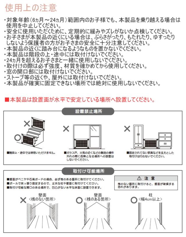 ・階段の上や窓の開口部には取付けないでください。 ・本製品が確実に固定できない場所では絶対に使用しないでください。 ・ストーブなどの近くや、屋外には取付けないでください ・既定サイズ以上に伸ばして使用することは出来ません。破損の原因になります。 |
