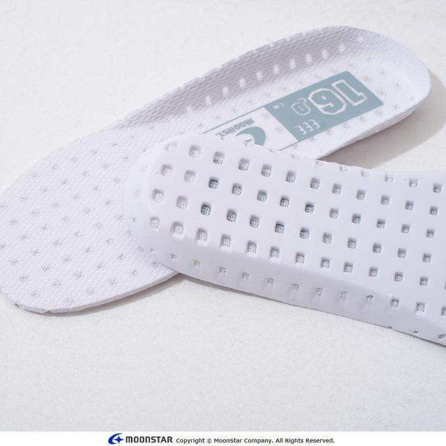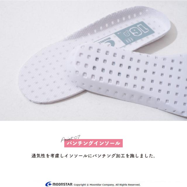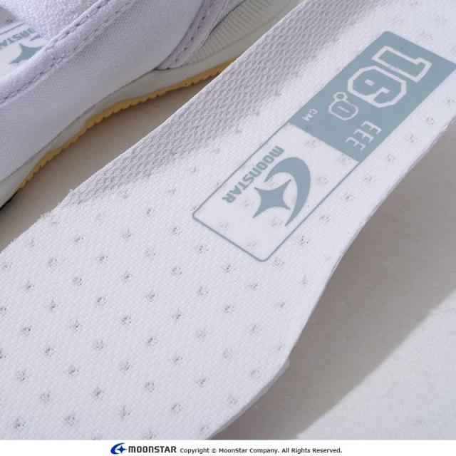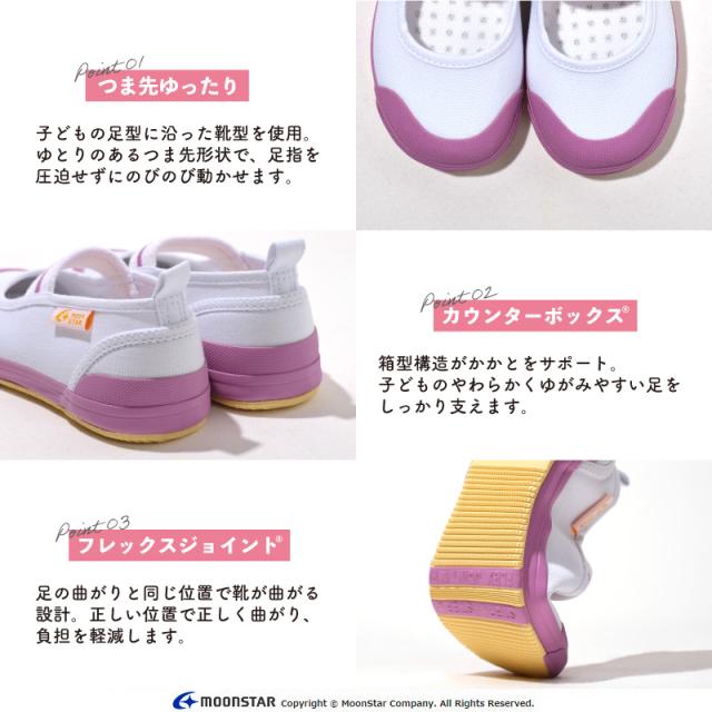 【商品特徴】 ロングセラーを続けるムーンスター「キャロット」の一本ゴムバンドタイプ上履きに3Eモデルが登場。甲高、幅広のお子様等におすすめです。つま先にゆとりを持たせた形状で、足の指を圧迫せずにのびのび動かせます。踵の「カウンターボックス」が、子どものやわらかくゆがみやすい足を箱型構造でしっかり支えます。「フレックスジョイント」は、足の曲がりと同じ位置で靴が曲がる設計で、足に余計な負担をかけません。インソールは足裏になじみ、取り出して洗濯ができるのでいつも清潔に保てます。また、「Ag+抗菌防臭」機能も搭載しています。重量は16.0cmで片足約120gです。