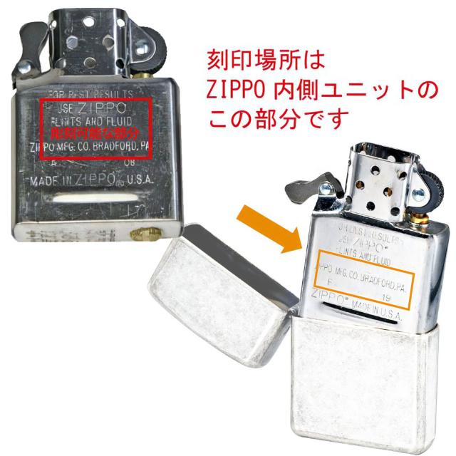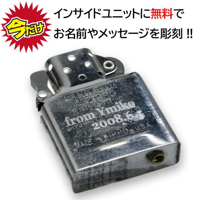 | ZIPPOのインナー(ZIPPOライター内部のオイルタンクユニット)にメッセージやお名前を彫刻致します。 オイルの補充をする際に必ず見ますので、彫刻していることを内緒で贈り、開けてビックリ♪サプライズ、恥かしがり屋さんにもピッタリです(^^ |