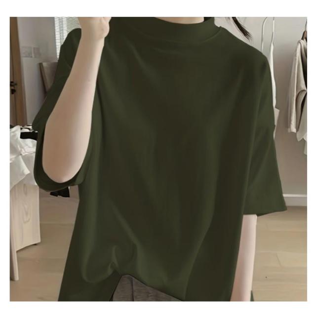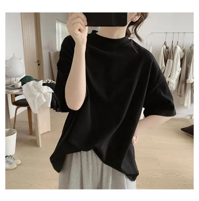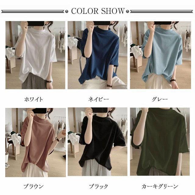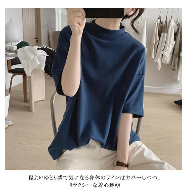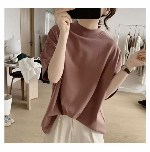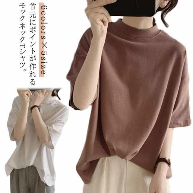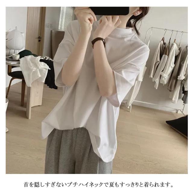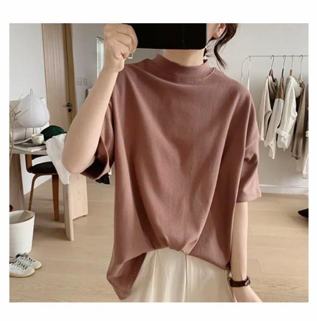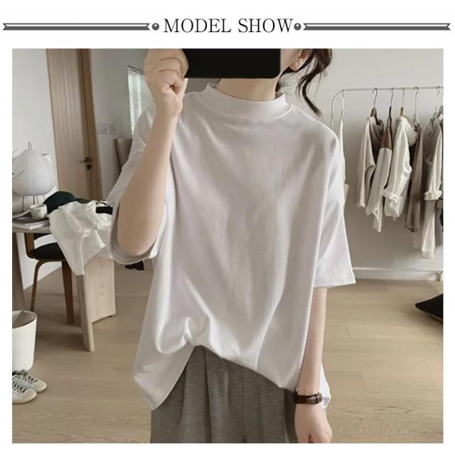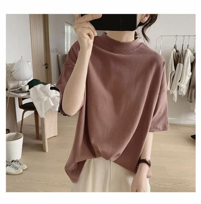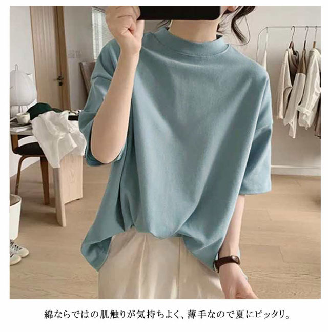 Tシャツ 女性 プチハイネック 綿 5分袖 半袖 体型カバー tシャツ 夏 ハイネック カットソー トップス レディース モックネック ゆったり ドロップショルダー 着?せ 大きいサイズ 無地 シンプル 通勤 薄手 大人