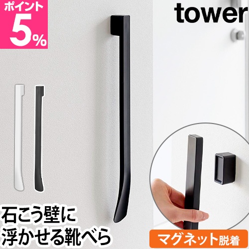 山崎実業 靴べら 靴すべり シューホーン 女性 男性 おしゃれ マグネット付き 北欧 スタンド付き 立て 可愛い 玄関 壁掛け シンプル モダン yamazaki タワーシリーズ デザイン 使いやすい プラスチック 黒 白 マグネットで付けるウォール靴ベラ タワー 石こうボード壁対応 tower 1636 1637 4903208016360 4903208016377